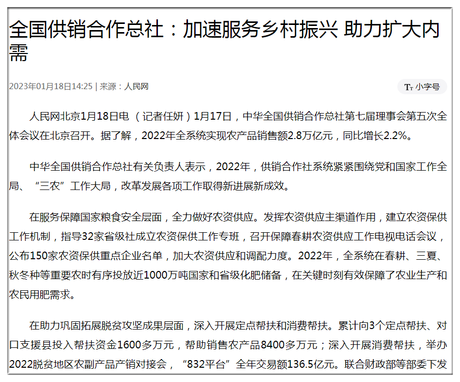 中華全國供銷合作總社有關(guān)負(fù)責(zé)人表示,2022年,供銷合作社系統(tǒng)緊緊圍繞黨和國家工作全局、“三農(nóng)”工作大局,改革發(fā)展各項(xiàng)工作取得新進(jìn)展新成效。